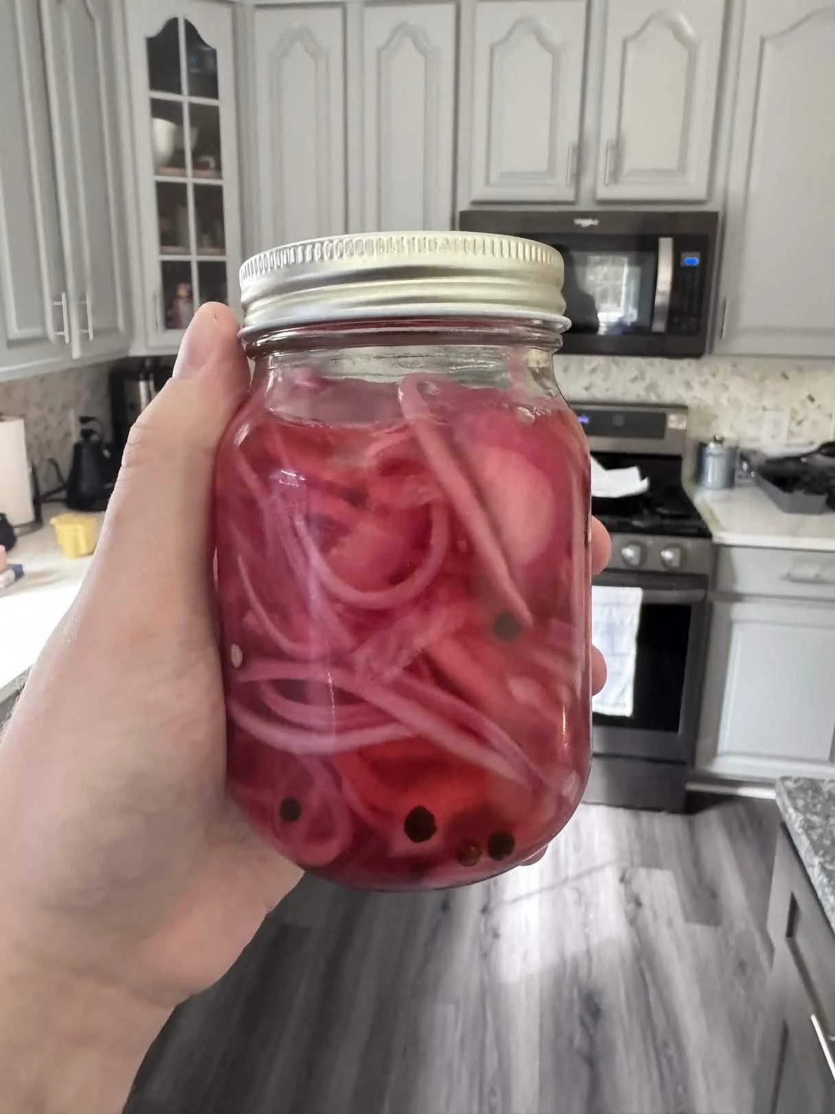 Last week I made smash chorizo tacos with sour cream, homemade guacamole, salsa, pickled red onions, feta cheese (subbed in for cojita), and the pickled onions. They were definitely filling, and I only ate 2 of the 3 I made myself! The red onions also added such a delicious flavor that I’ll keep making them for anything we need them for.